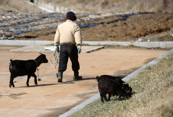 무덤덤한 표정의 아저씨와 계속 뒤를 보며 재촉하는 염마 염소와 세상의 모든것이 호기심으로 보이는 아기 염소들.